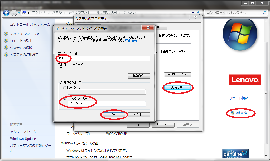 1.コンピューター名、ワークグループ名設定