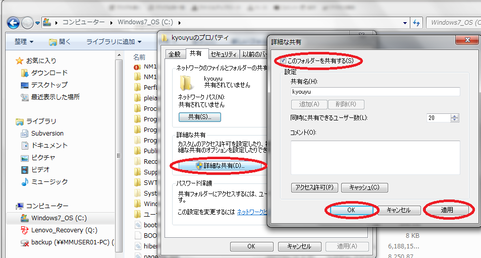 2台のパソコンが見ることのできるフォルダを作成します(既存のフォルダに設定してもOK