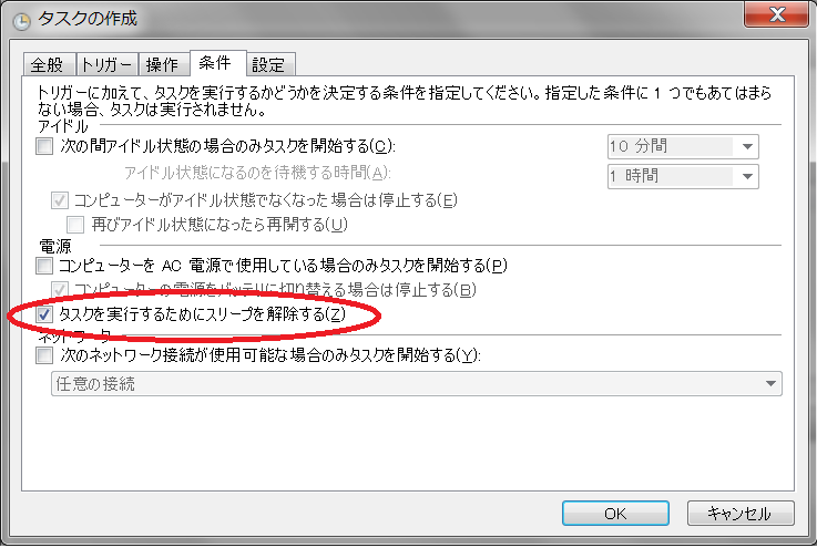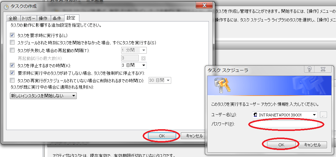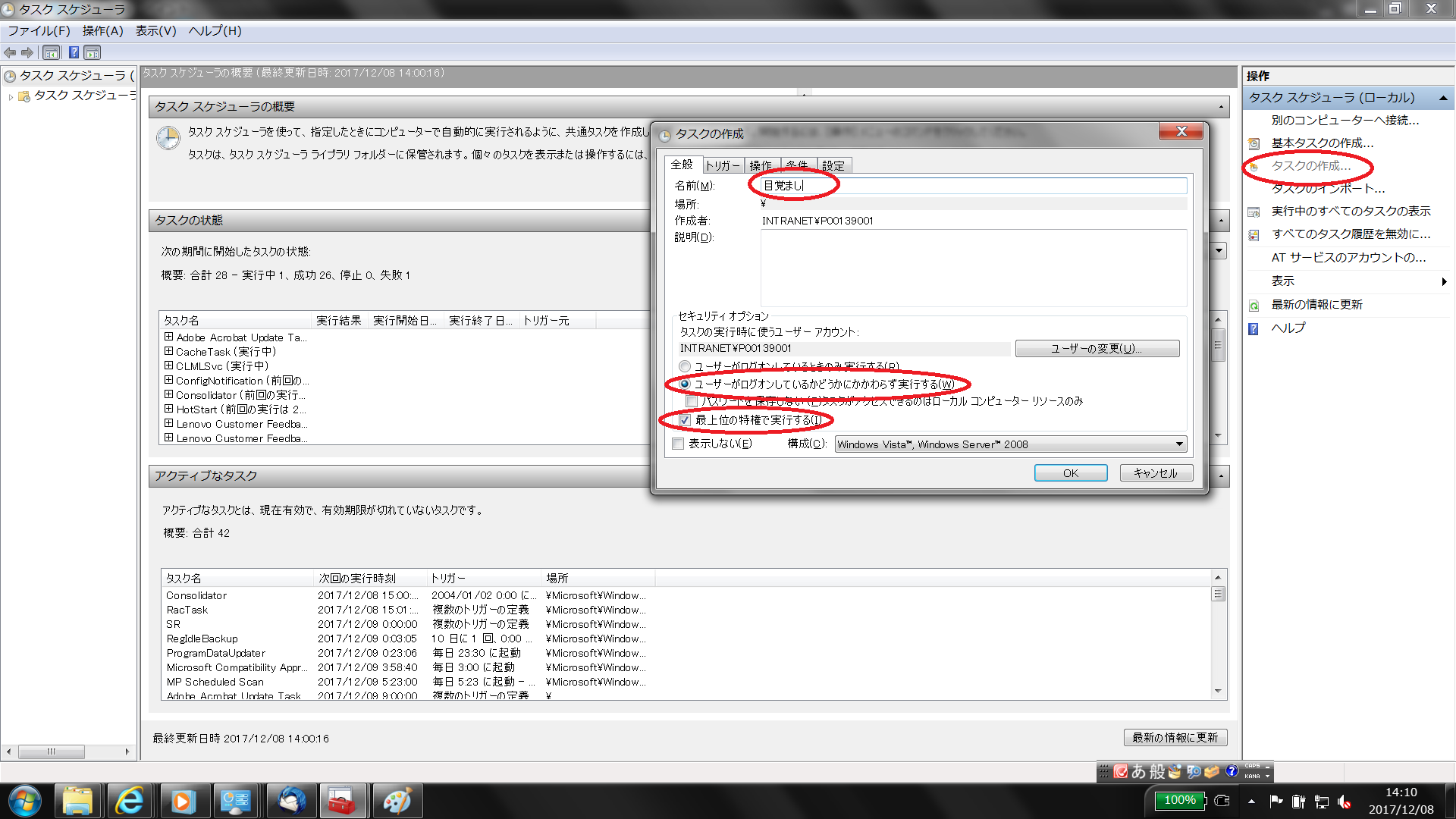[ログオンにかかわらず実行][最上位の特権で実行]を選択