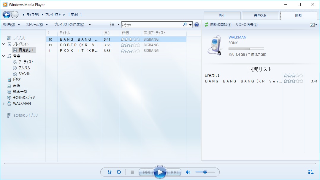 ドラッグで曲を「同期リスト」に追加して「同期の開始」で転送します